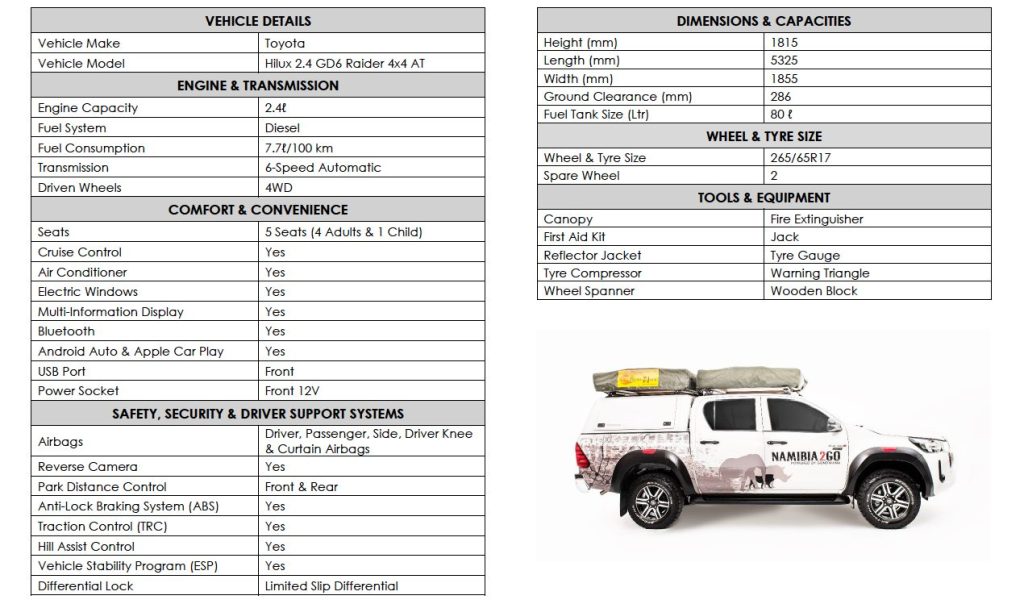 – Prise en charge de votre véhicule Namibia2Go Car Rental 4×4 Comfort Camping Equipped Double Cab à