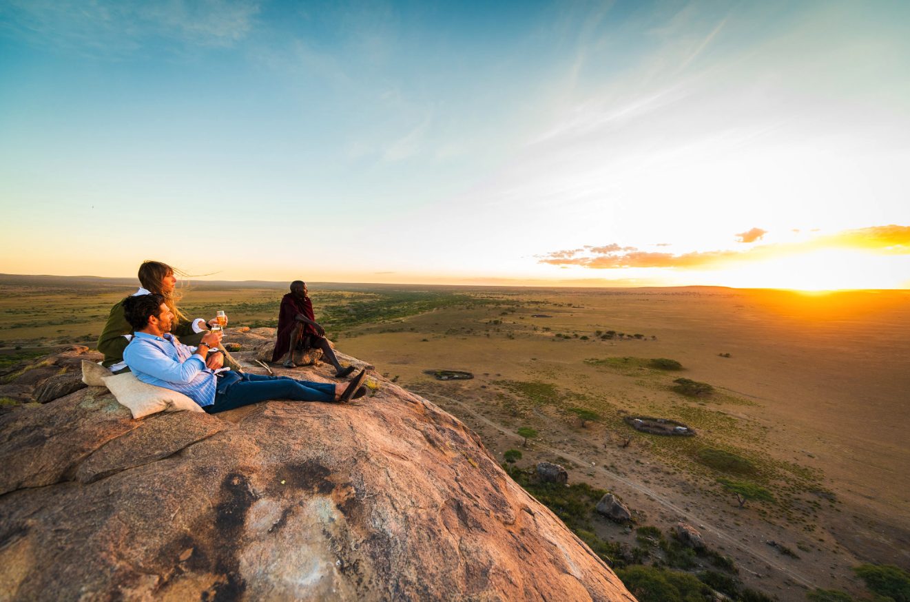 Arrivée au camp et départ pour une petite marche escortée de Masais pour aller admirer, du haut d’un Kopjes, le coucher du soleil sur les plaines du Serengeti.