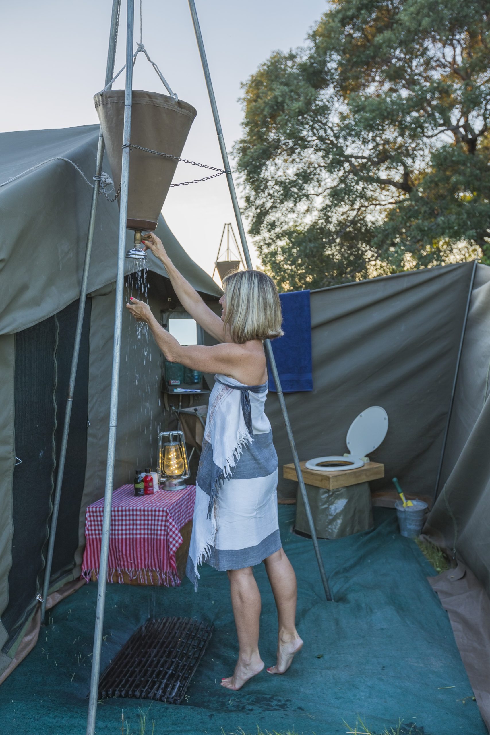 Tente de type « mini Meru » (4m x 3m x 2,50m) à larges fenêtres avec moustiquaire, la literie complète (lit, matelas, draps, couette, oreiller, bouillotte en hiver), le mobilier (tapis, chaises de safari, éclairage) et un auvent meublé (2m x 2,5m). Un espace sanitaire privatif attenant (2m x 2,5m) avec douche (eau chaude), toilettes sèches et équipement: table, bassine, miroir, petite serviette de toilette et grande serviette de bain.